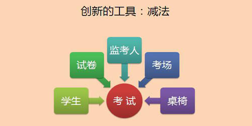 以一场考试为例,原则上需要有学生、试卷、考场、监考等多个要素。而利用“减法工具”,可以进行一些列的追问: